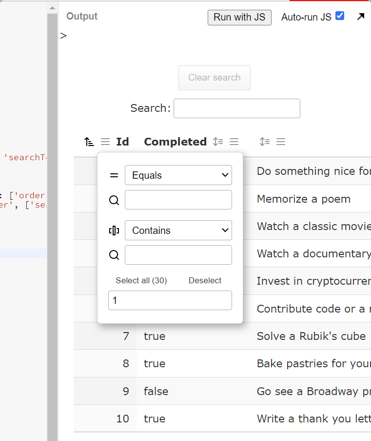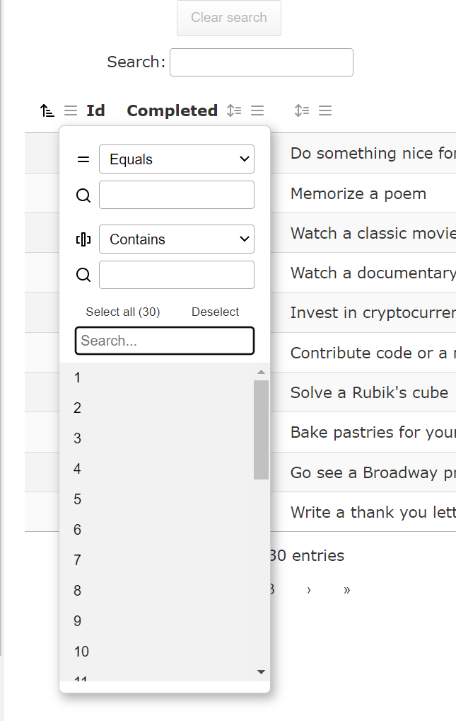 However, selecting an option from the searchList does not filter the table for Boolean and number data types.