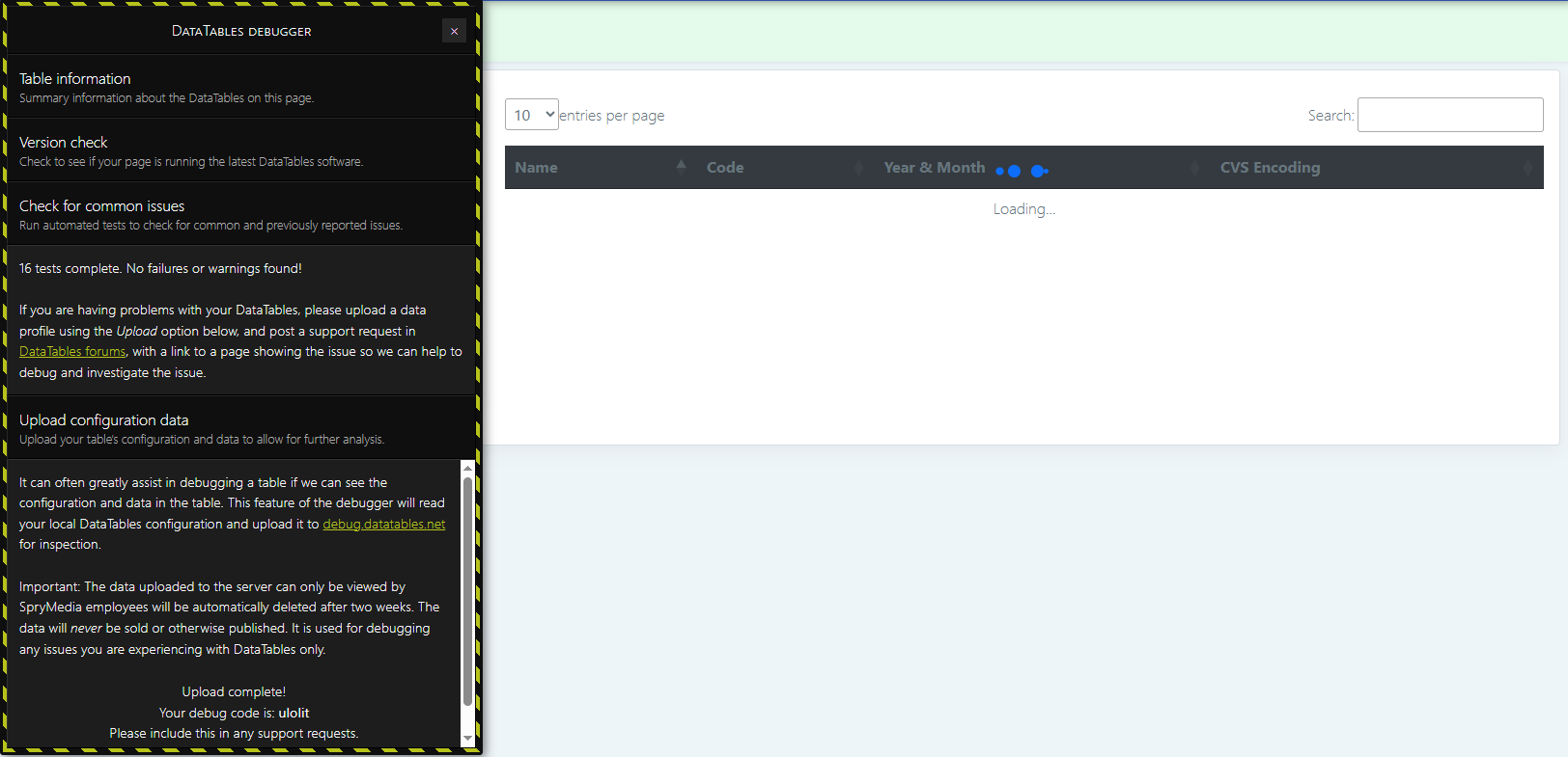 DataTable stuck on processing even if AJAX response is fine. It only shows the loading icon.