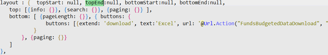 info,search,pagingandpageLengthwith empty objects. You could just define them as strings if you aren't applying non-default settings for them. For example:Is this what you are asking?