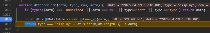 Now I notice the built-in datetime render function Datatables.render.datetime() (and time()) converts my times to UTC+0, which confused a lot of my users (including me).