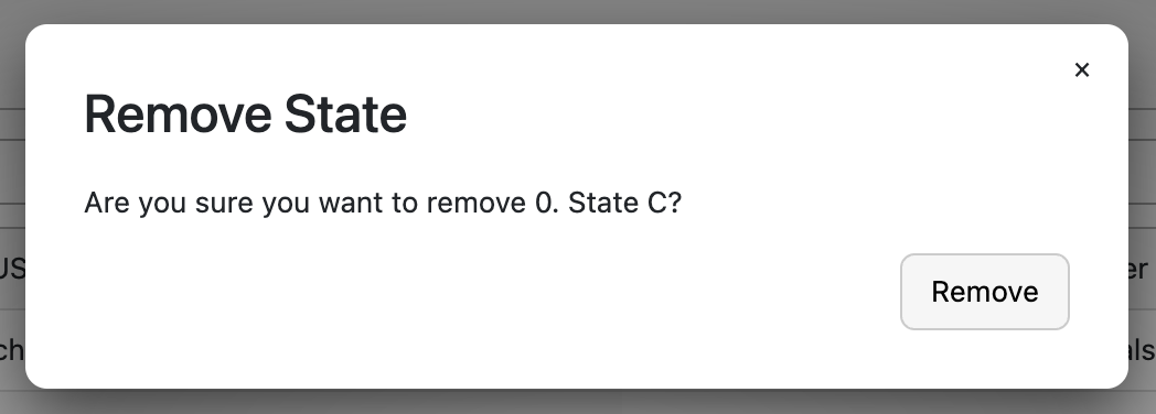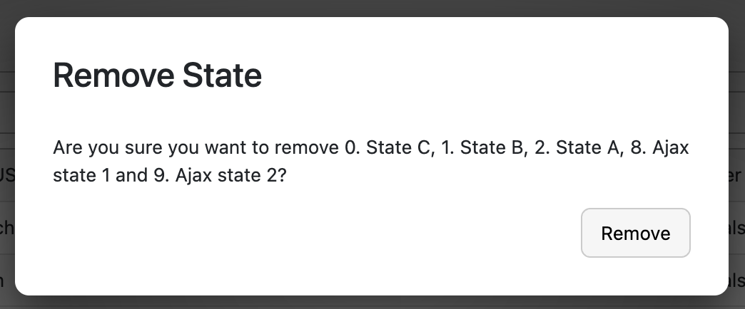 One other thing I wanted to ask is if there's a way to add a confirmation modal to the "Remove All" for states. By default there's a confirmation modal when you try to remove a single state which seems reasonable but there's no confirmation modal if you remove all of the states at once which seems odd given it's potentially far more destructive. A confirmation modal by default would be great. I couldn't figure out a simple way to add one in manually.