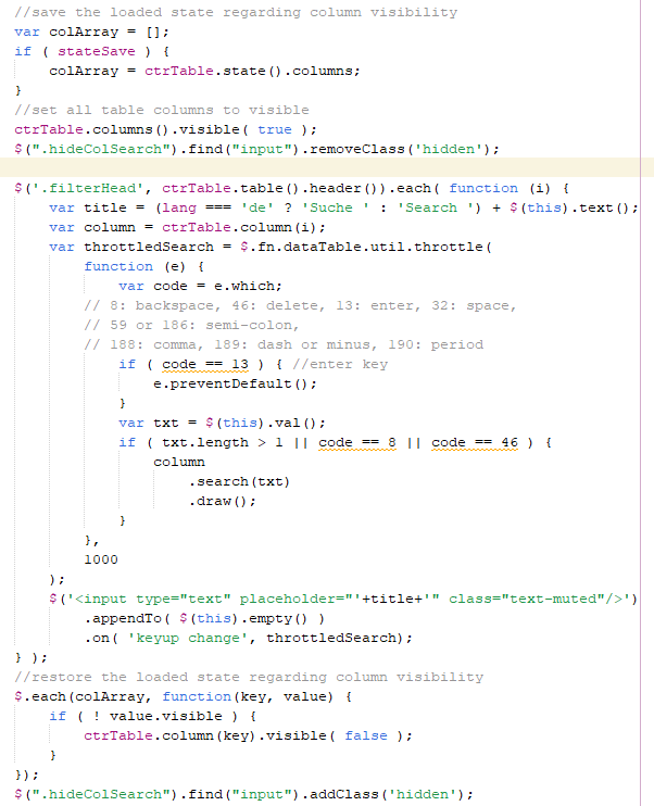 This is what it looks like. The search fields also have placeholders named after the field name plus the German word for "search". I also needed to make all columns visible temporarily to make it work - and then restore the loaded state right afterwards. Fairly complicated ... I probably would have never gotten this running without Kevin's input.
